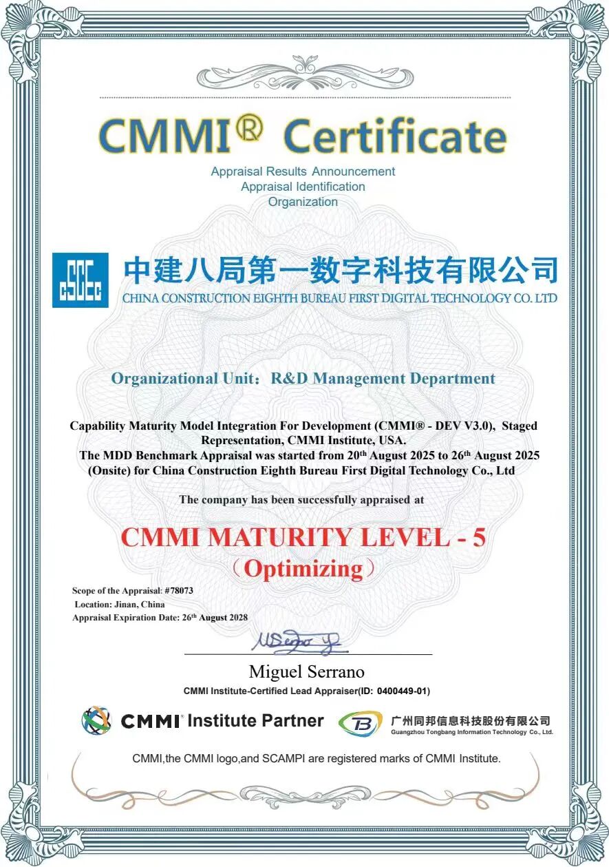 近日,中建八局第一數字科技有限公司成功通過 CMMI-DEV V3.0 成熟度五級(簡稱 CMMI5 級)認證,該認證是全球軟件領域的最高級別認證,標志著公司在軟件研發、流程化管理與交付運維能力上達到行業一流水平,數字化轉型取得關鍵成效。
