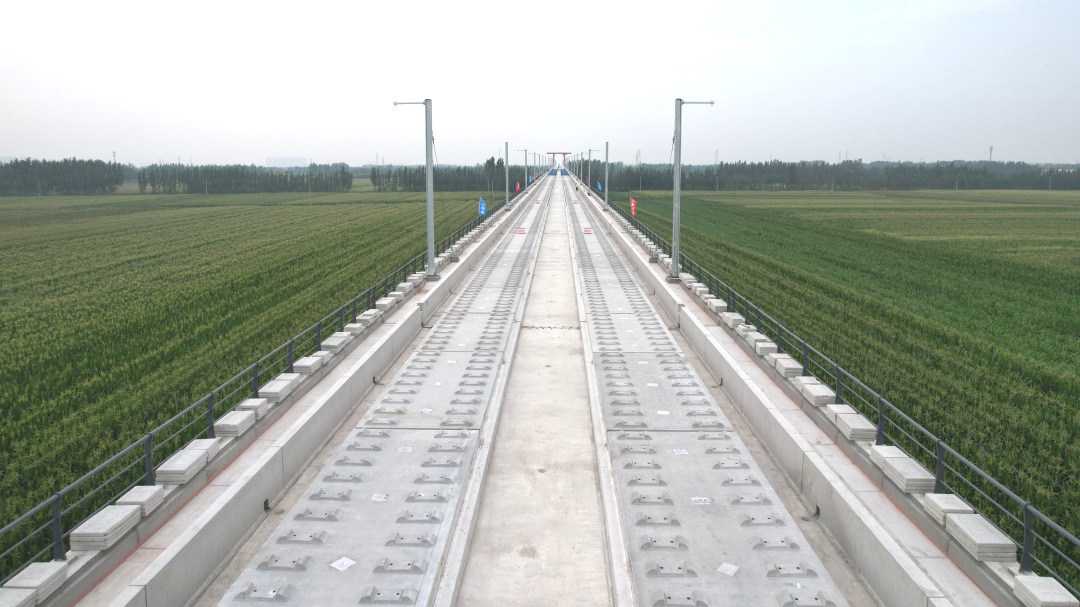 跨徒駭河 144 米系桿拱是濟濱高鐵全線控制性工程,該橋梁總長 148 米、主跨徑達 144 米,橋面軌道板安裝精度直接影響線路整體運行安全。為保障結構穩定,項目團隊創新采用預壓工藝模擬橋梁荷載,同步精準測量梁體變形數據,配合無懸臂門式起重機吊裝作業,成功實現大跨度橋梁軌道的精確安裝。